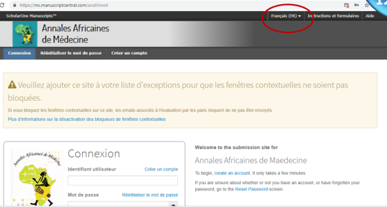 Les Annales Africaines de Médecine ont le plaisir de vous informer que le site de soumission hybride (français ou anglais voir cercle rouge) des articles en ligne est maintenant fonctionnel depuis ce matin. Tous les articles sont désormais en ligne voir onglet soumission sur ce site